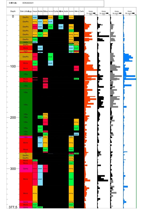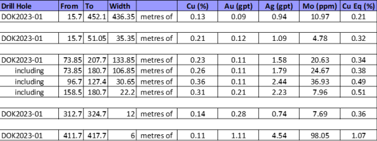 John Ryan, a member of MTB’s Technical Advisory Board, commented: "Having worked in multiple BC porphyry mines and after leading exploration programs on numerous porphyry systems, I consider these results to be extremely encouraging. The grade and width of the intercepts in DK-2023-01 is comparable to drill holes from active BC Alkalic Porphyry mines and is a great indication that the Dok system has considerable potential within its multi-kilometer footprint. The fact that this was the first hole by the MTB Metals team speaks to the success of the team’s systematic approach."