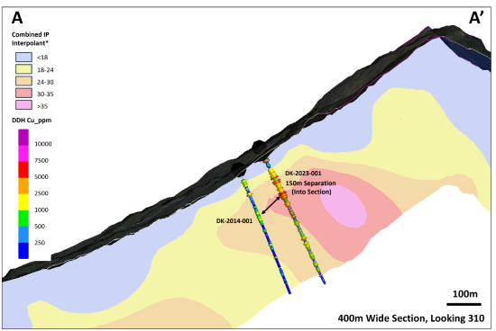 Hole DK2023-01 intersected 107 metres of 0.38% CuEq (see Table 1 for details). Another 6-meter interval carries 1.07% CuEq. Those intersections are within 436 metres of mineralization averaging 0.21% CuEq. Hole 1 is on the margin of a prominent IP chargeability zone that appears to be dipping away from the drill hole trace as detailed and illustrated in Figure 1.