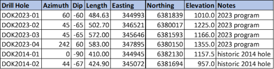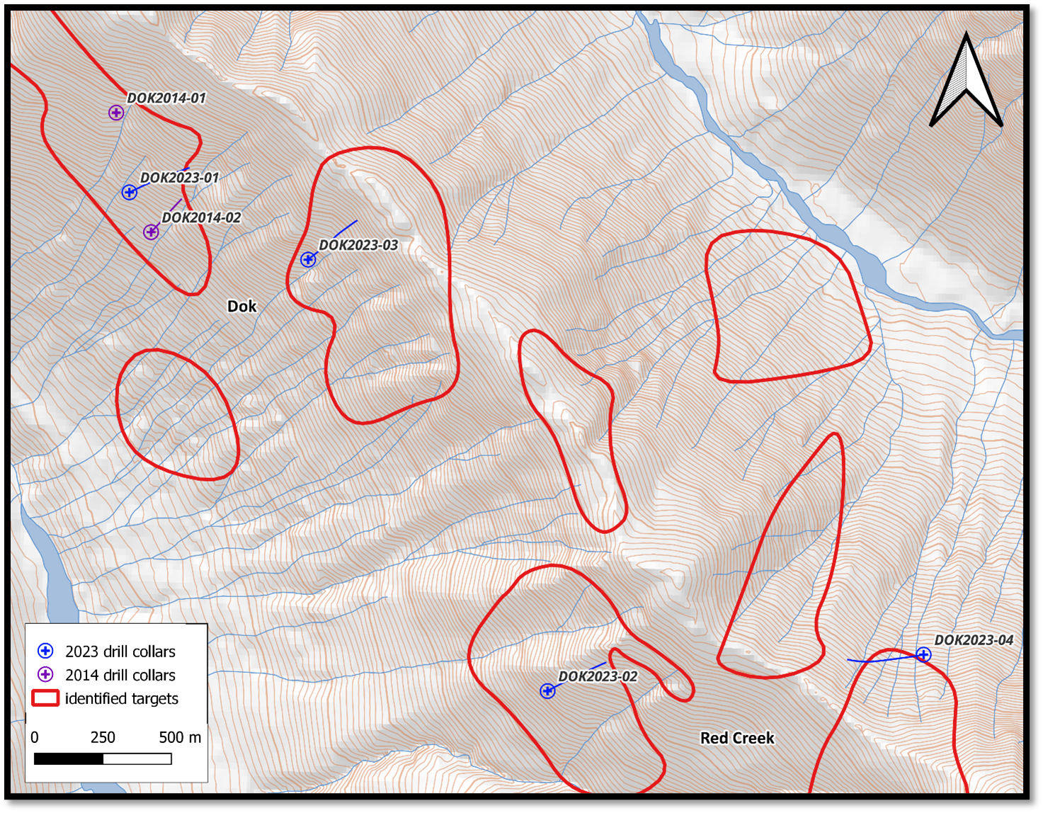 Two diamond drill holes were completed in the vicinity of the Dok Zone. Hole DK-2023-01 ended at 484 metres depth and Hole DK-2023-03 ended at 572 metres depth. The holes are 700 metres apart and define a single target. Both holes targeted an Induced Polarization (“IP”) chargeability anomaly which underlies coincident high-grade surface mineralization and elevated copper in soils, within a pronounced magnetic anomaly.