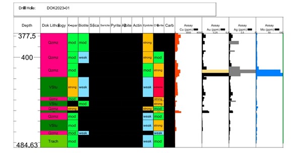 Figure 3 DK-2023-001 strip log showing lithology, alteration, and assays.