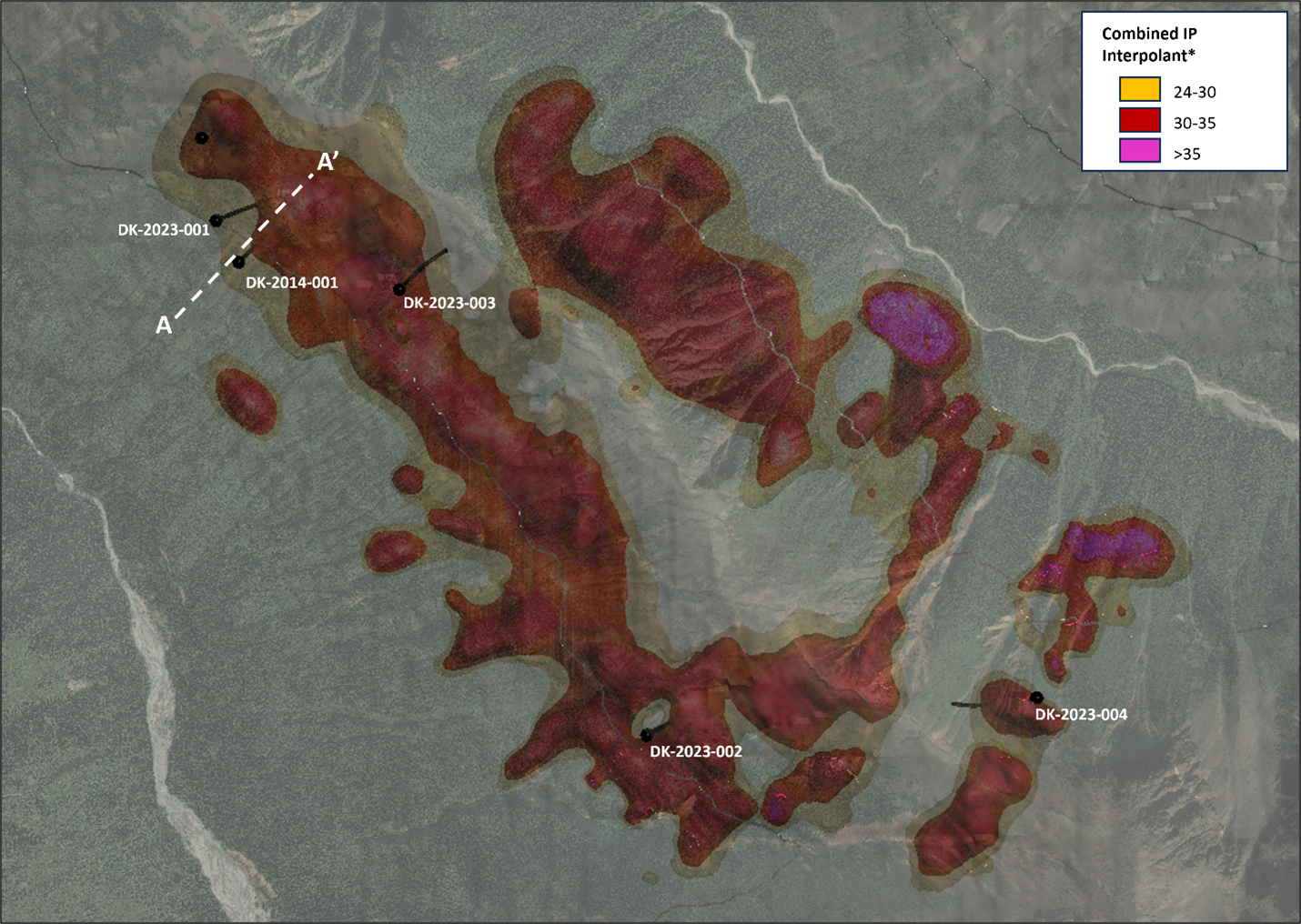 Figure 1 - Cartoon Cross Section through drill holes DK-2023-001 (right) and DK-2014-001 (left) and chargeability. The merged data is from 3 programs, conducted in 2012, 2022 and October of 2023. It has not been leveled by a geophysicist and is for illustrative purposes only.