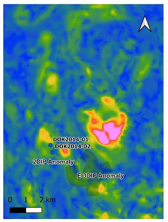Figure 1: Magnetization Vector Inversion (MVI) following depth slice at -300 metres with 2014 drill collar locations and trace of Induced Polarization (IP) chargeability anomaly.