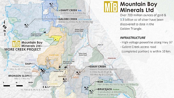 Vancouver, BC – Mountain Boy Minerals Ltd (“Mountain Boy” or the “Company”) (TSX.V: MTB; Frankfurt: M9UA) reports the acquisition, through staking and purchase, of a 100% interest in the More Creek property, located 40 km northwest of the historic Eskay Creek Mine. The 4,970 ha (49.7 sq km) property is adjacent to the Newmont Lake property which is now being drill-tested.
