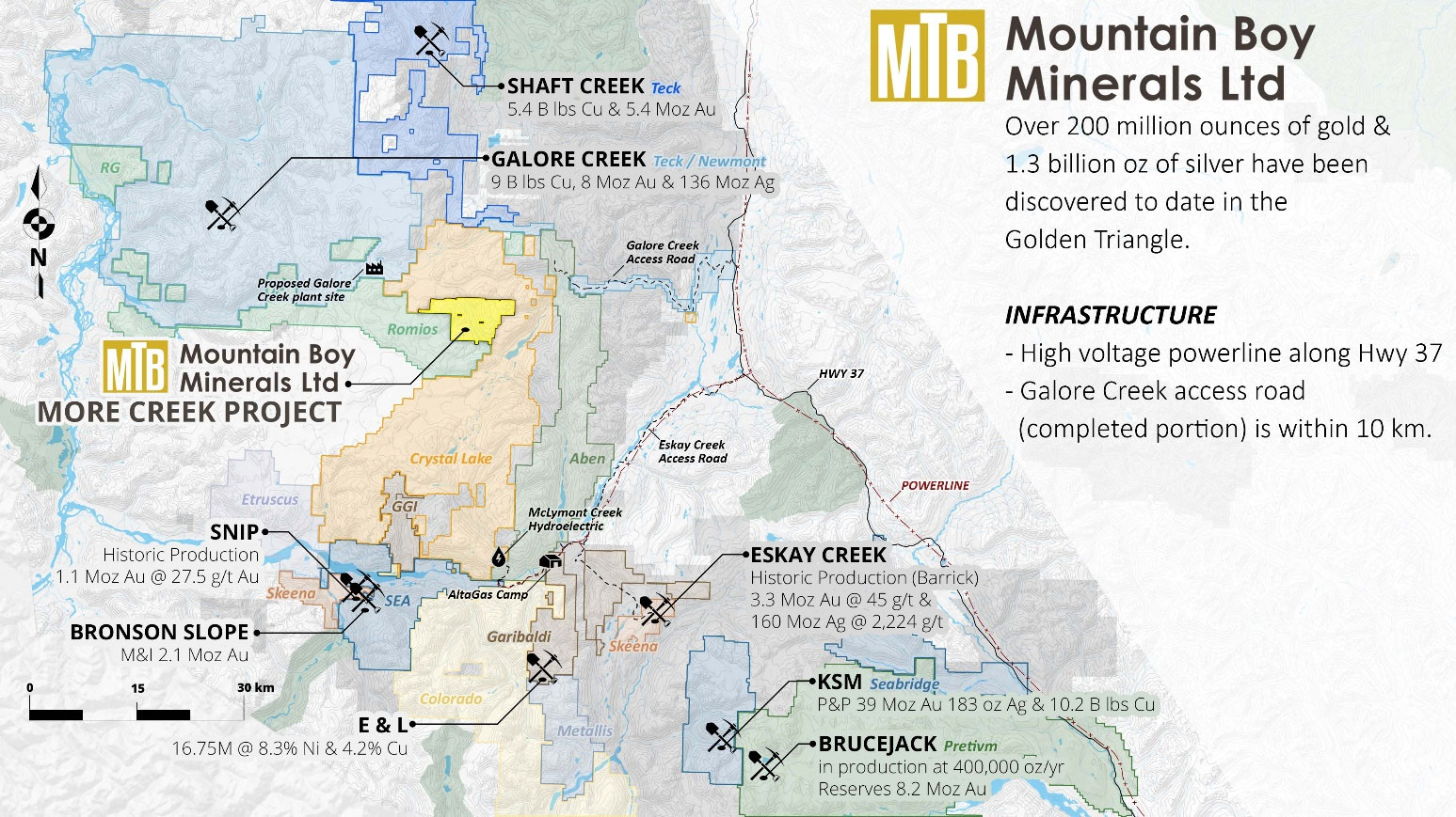 Vancouver, BC – Mountain Boy Minerals Ltd (“Mountain Boy” or the “Company”) (TSX.V: MTB; Frankfurt: M9UA) reports the acquisition, through staking and purchase, of a 100% interest in the More Creek property, located 40 km northwest of the historic Eskay Creek Mine. The 4,970 ha (49.7 sq km) property is adjacent to the Newmont Lake property which is now being drill-tested.