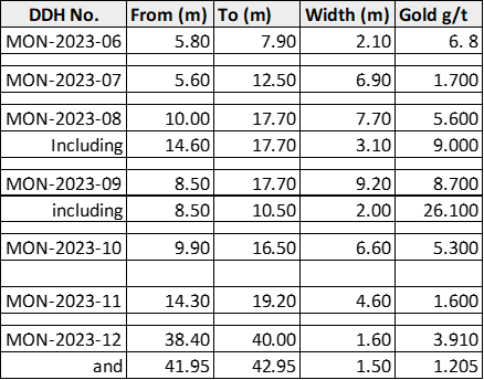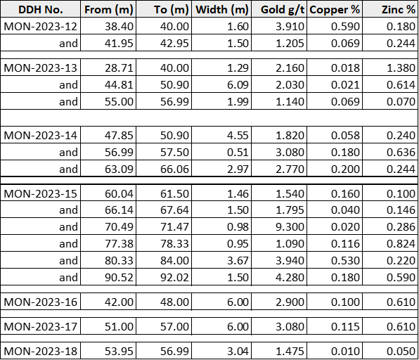 The 2023 program was designed to test the northern extension of the Montrose Zone as well as define near surface high grade gold-copper for a potential 10,000 tonne bulk test in the Upper Montrose area. Drilling results for both phase 1 (reported in MTB NR, July 18, 2023) and phase 2 are shown below.