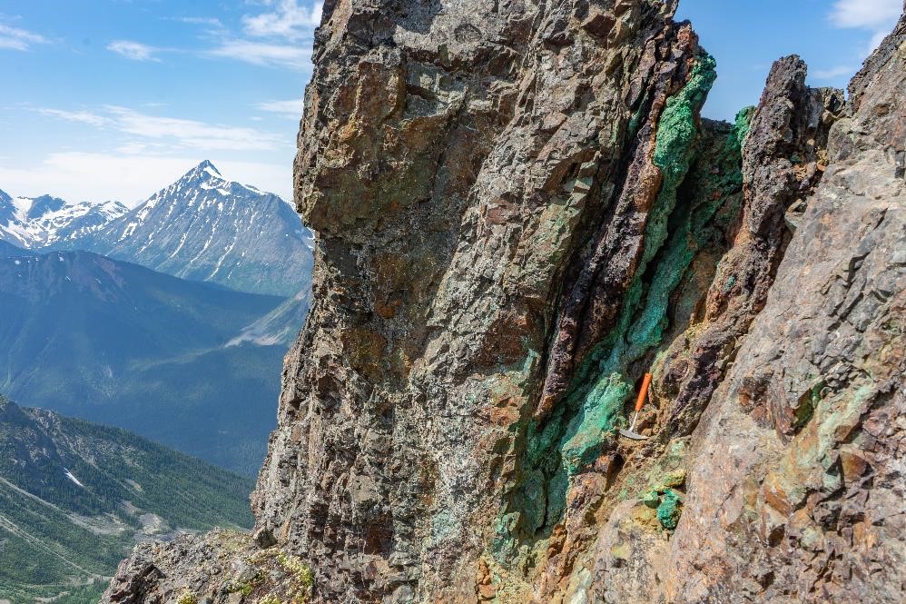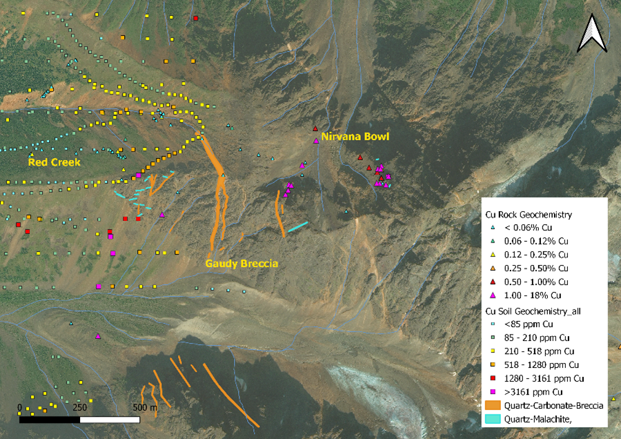 During the 2021 field season, numerous outcrop and talus samples grading more than 0.5% copper (up to 17.9%) were discovered 3.7 km southeast of the historic drilling at Dok in an area now known as Nirvana Bowl. (See the News Release December 13, 2021.) Work this season has discovered a series of epithermal-style veins up to 750 m west of Nirvana Bowl (Figure 1). The veins are interpreted to be related to an underlying porphyry system.