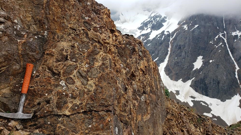 The area has the visual characteristics and scale of a porphyry system, including the dyke swarm and the large areas of iron oxides after sulphides (now largely supergene oxidized). Work is underway to determine if this mineralized area is part of the same system as the Dok trend or is a distinct mineralizing system.