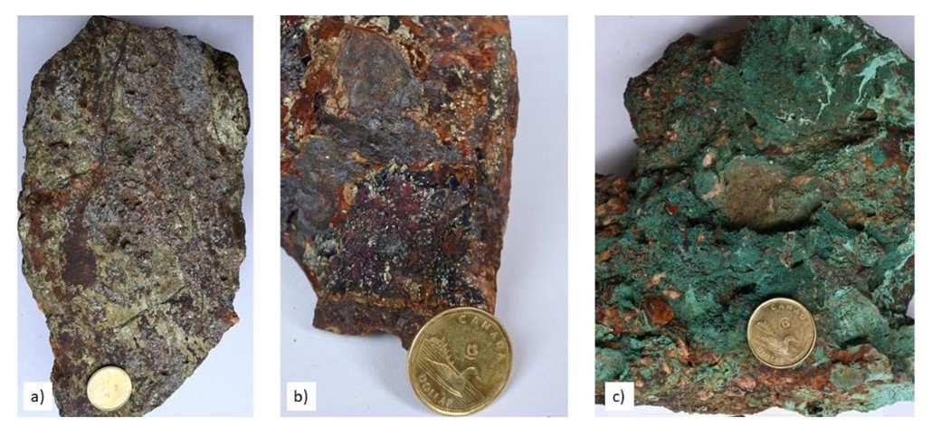 Two main styles of vein mineralization are observed, including quartz-carbonate hydrothermal breccia veins (Figure 2) and quartz-malachite>sulfide veins (Figure 3). The veins are hosted in a porphyritic to aphanitic andesite. Detailed photos of some of the representative styles of mineralization (Figure 4) include a) sample of massive sulphide, dominantly pyrite; b) massive pyrite with covellite; c) massive malachite>azurite>chrysocolla in a vuggy quartz vein.