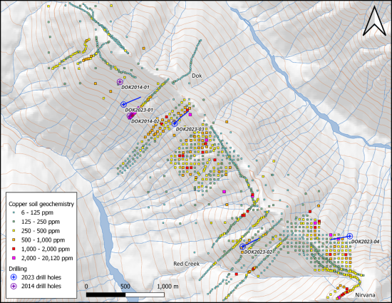 Figure 1: Dok ridge copper in soils with 2014 and 2023 drill hole collars. These data represent all the samples taken since the acquisition of the property in 2021.