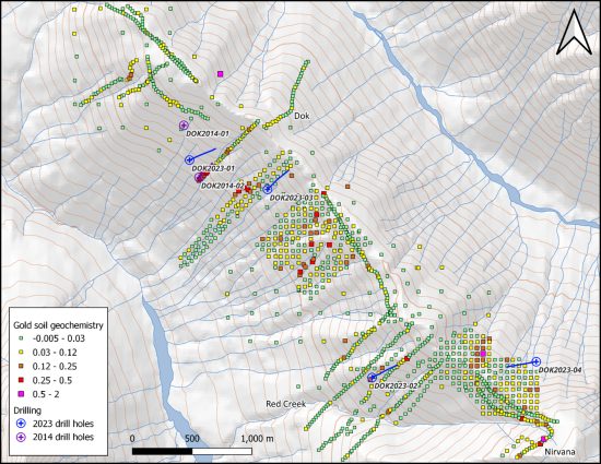 Figure 2:Dok ridge gold in soils with 2014 and 2023 drill hole collars. These data represent all the samples taken since the acquisition of the property in 2021.