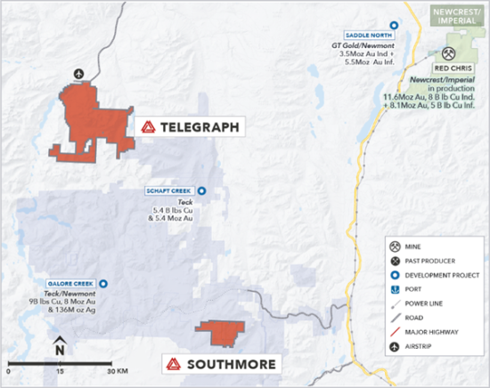 - Telegraph is located in the vicinity of 4 world-class porphyry deposits being advanced by major mining companies: Galore (Teck / Newmont), Schaft (Teck), Saddle (Newmont) and the operating Red Chris copper-gold mine (Newcrest / Imperial Metals). Field work by MTB on its 344 square kilometre property, together with earlier results, provides compelling evidence for the presence of one or more porphyries, similar to others in the area.
