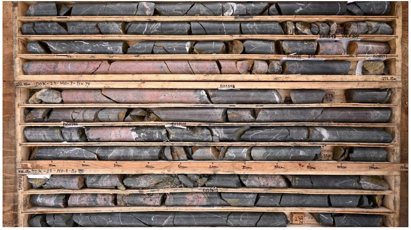 - A 700-meter step out from drill hole DOK2023-01 intersects several copper-gold intervals.