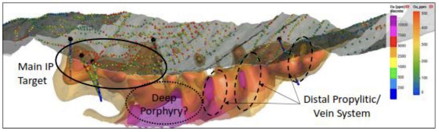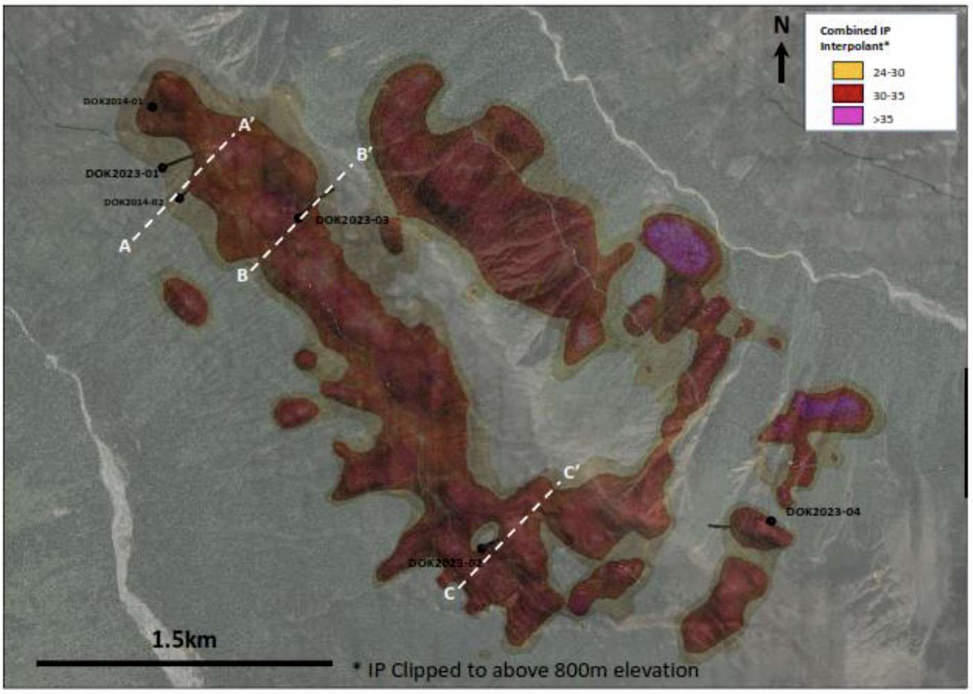 Lawrence Roulston, CEO, stated: “These initial holes have confirmed the presence of a porphyry hydrothermal system spanning at least 3.3 kilometers. This is a large, complex, multi-phase system is located in the same geological setting as four other world class deposits located in the area. Significant exploration potential exists along the Dok Trend. This premise is supported by drilling, a continuous induced polarization (IP) chargeability anomaly, fertile porphyry intrusive units, and anomalous copper and gold in soil geochemistry. Continued compilation of the drilling results together with the late-season 3DIP and other geological information will provide a basis for vectoring toward the core of the system with subsequent drilling.”