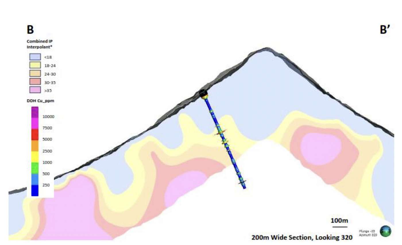DOK2023-03 targeted a moderate IP chargeability anomaly, underneath an outcrop which returned high-grade grab samples including 3.22% copper with 4.62 g/t gold. The hole was placed along the most easterly line from the 2012 IP program and the 2023 3DIP data had not been collected. Table 1 highlights the significant assays from the hole.