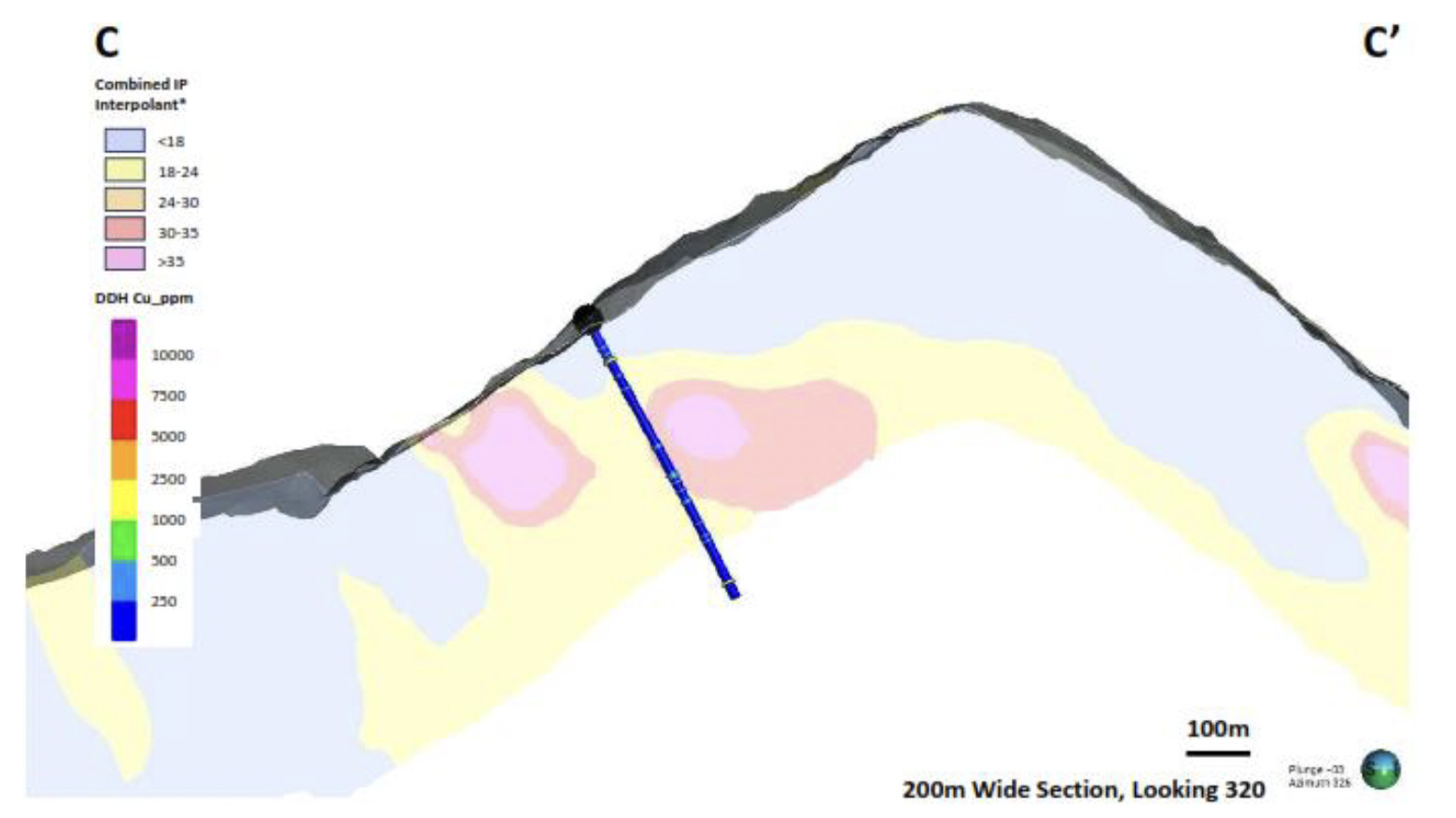 Figure 5: Long section through 2023 drilling with merged IP data plotted sub-surface, darker pinks representing higher chargeability.