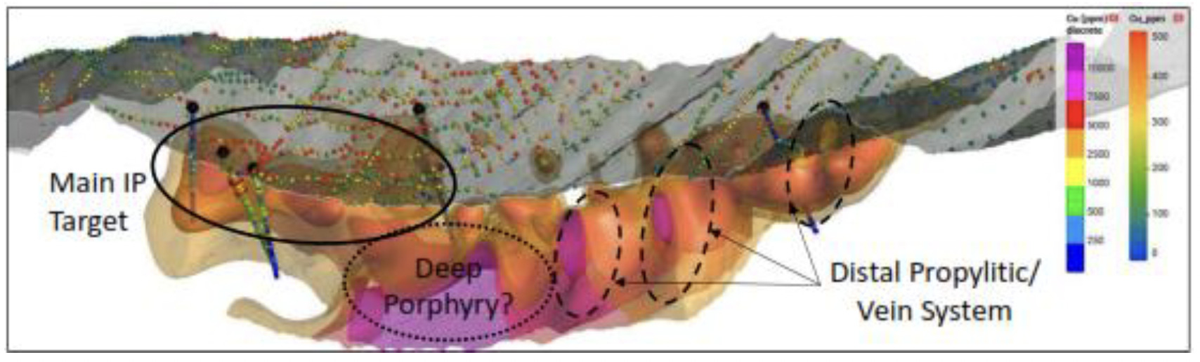 Lawrence Roulston, CEO, stated: “These initial holes have confirmed the presence of a porphyry hydrothermal system spanning at least 3.3 kilometers. This is a large, complex, multi-phase system is located in the same geological setting as four other world class deposits located in the area. Significant exploration potential exists along the Dok Trend. This premise is supported by drilling, a continuous induced polarization (IP) chargeability anomaly, fertile porphyry intrusive units, and anomalous copper and gold in soil geochemistry. Continued compilation of the drilling results together with the late-season 3DIP and other geological information will provide a basis for vectoring toward the core of the system with subsequent drilling.”