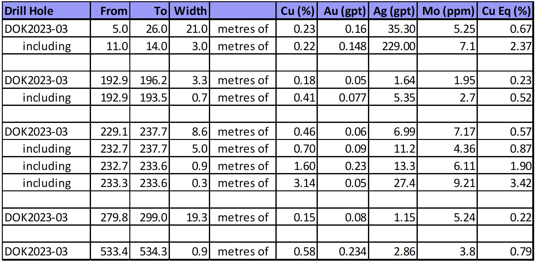 DOK2023-03 targeted a moderate IP chargeability anomaly, underneath an outcrop which returned high-grade grab samples including 3.22% copper with 4.62 g/t gold. The hole was placed along the most easterly line from the 2012 IP program and the 2023 3DIP data had not been collected. Table 1 highlights the significant assays from the hole.