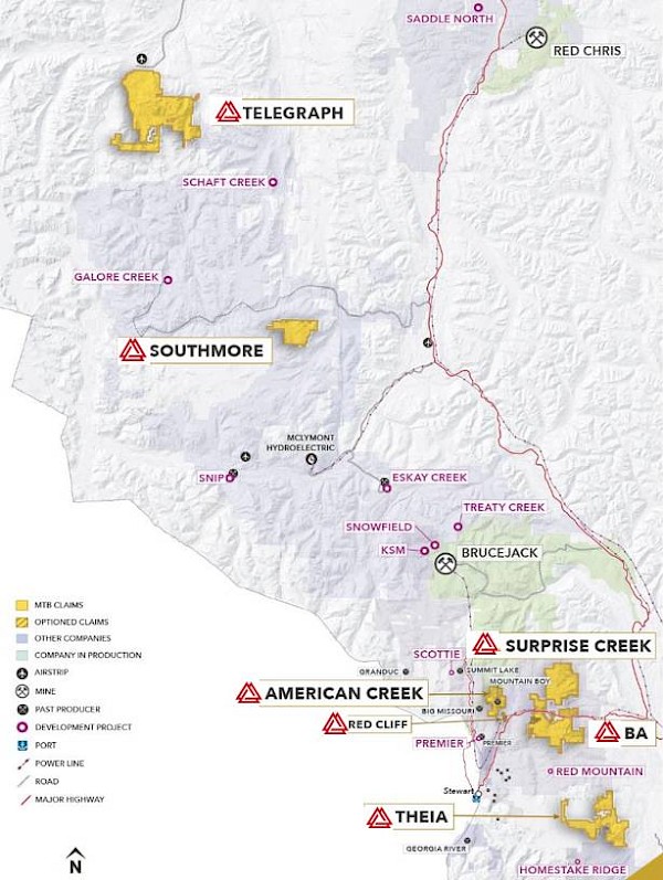 1. The flagship American Creek project is centred on the historic Mountain Boy silver mine, and is just north of the past-producing Red Cliff gold and copper mine (in which the company holds an interest). The American Creek project is road-accessible and 20 kilometres (km) from the deep-water port of Stewart.