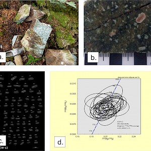 Figure 4 - a.) Sample AC-12 in the field. b.) Close-up photograph of sample ACW-12. c.) Cathodoluminescence image of zircon collected from sample ACW-12. d.) Concordia plot for sample ACW-12